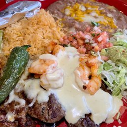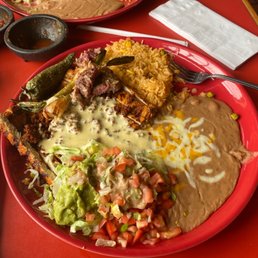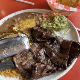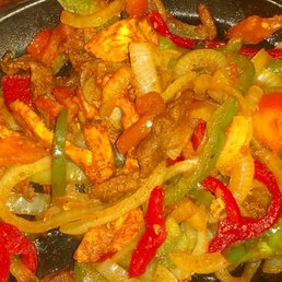 Strips of fajita meats sauteed with bell peppers, onions and tomatoes. Serviced with rice, refried beans, guacamole, sour cream, shredded cheese, salad and flour or corn tortillas