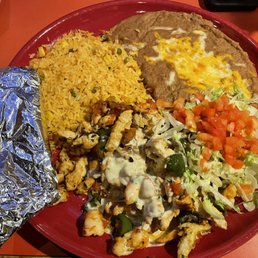 Strips of Chicjen fajita meats sauteed with bell peppers, onions and tomatoes. Serviced with rice, refried beans, guacamole, sour cream, shredded cheese, salad and flour or corn tortillas
